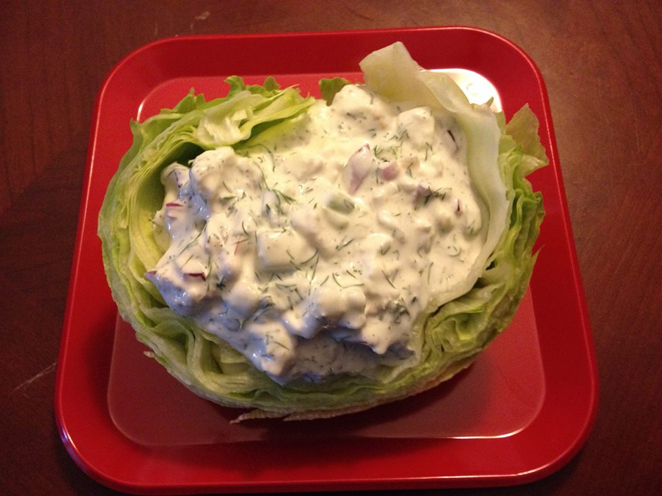 Tear the first few layers from the center of each iceberg wedge (creating a "bowl" in the wedge) and put them on individual salad plates. Divide the shrimp salad among each plate, filling the lettuce "bowl" and letting the salad spill over onto the wedge. Garnish with chopped dill. Serve cold or at room temperature.
